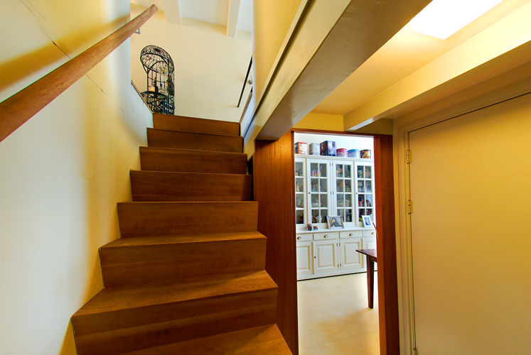 By taking away all walls, each of the two levels of the apartment becomes open space, divided only by a floor. Between the two stories of the apartments there is a double high open space which is oriented to the west thus letting sunlight enter the whole apartment.