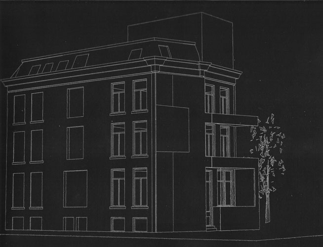 A study for the possible reuse of an office building in a main junction of the city.The design is for a double story business with two double story apartments above.The empty unused triangle area of the site is being used to add outside spaces for each of the units. The facades manifest the different structures of the city parts this building stands between. The diagonal façades stays as is (with no windows) to function as a billboard for the advertisement entrepreneur who owns the building.